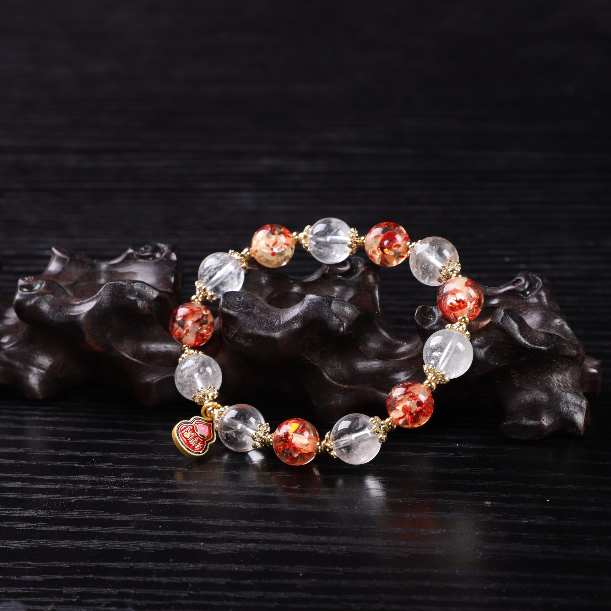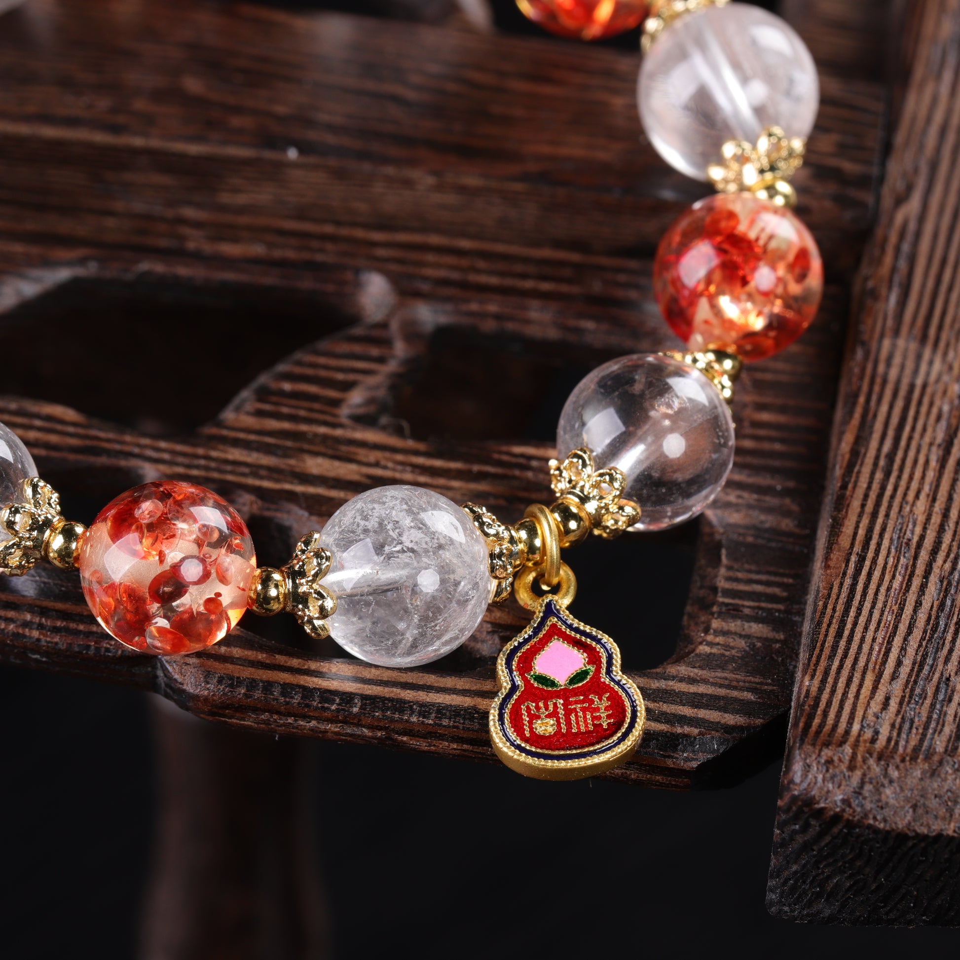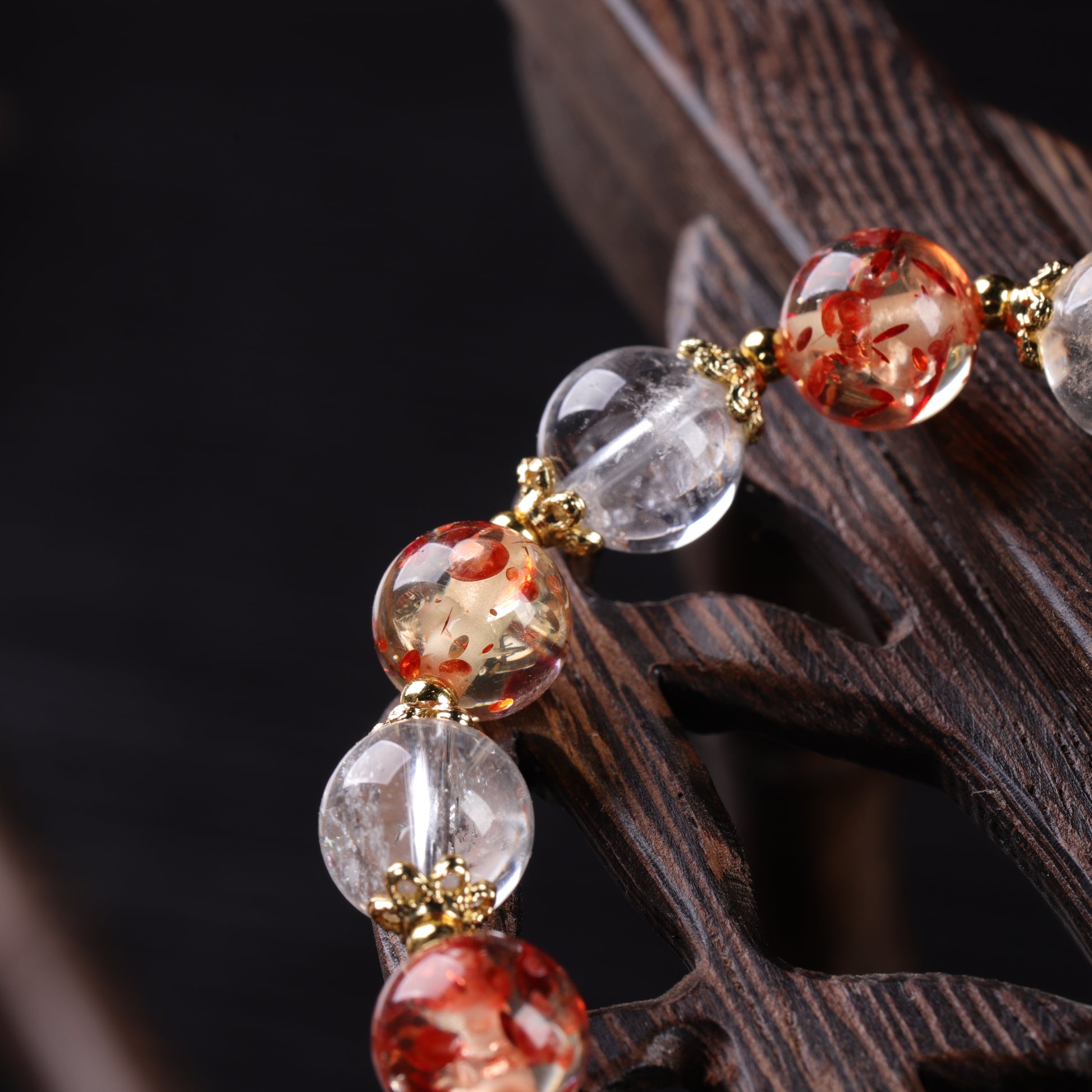 The alternating clear and floral - patterned glazed beads create a harmonious and eye - catching design. The red floral patterns on the beads are like blooming flowers, symbolizing vitality and prosperity. The clear beads add a touch of purity and transparency. The small pendant at the bottom, with its intricate design, further enhances the bracelet's charm and carries auspicious meanings.