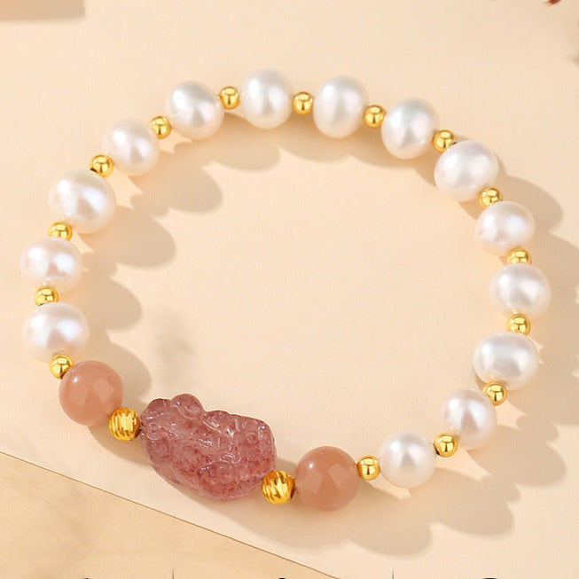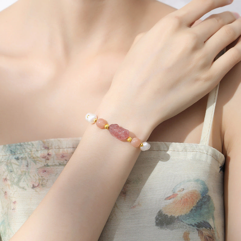 S925 Silver Strawberry Quartz & Pearl Pixiu Bracelet - Fortune & Vitality