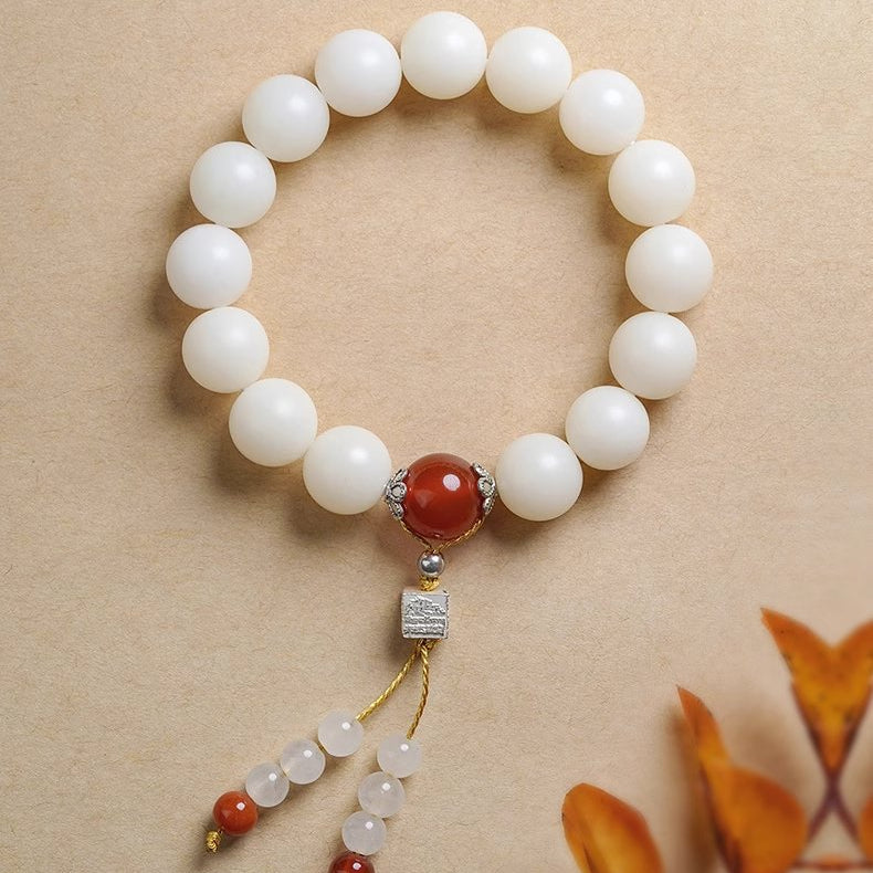 Combining luminous white Bodhi root beads—a Buddhist symbol of purity, wisdom, and spiritual awakening—with a radiant red agate centerpiece, this bracelet embodies harmony and renewal.